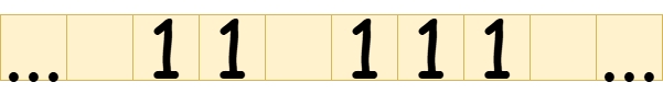We can use the tape as a means of representing numbers. Since tape cells can only contain the symbol if they are not left blank, we will have to use the unary number system to represent numbers. For example, here's a representation of a tape containing the decimal number , assuming the representation convention is to repeat times to represent a number .